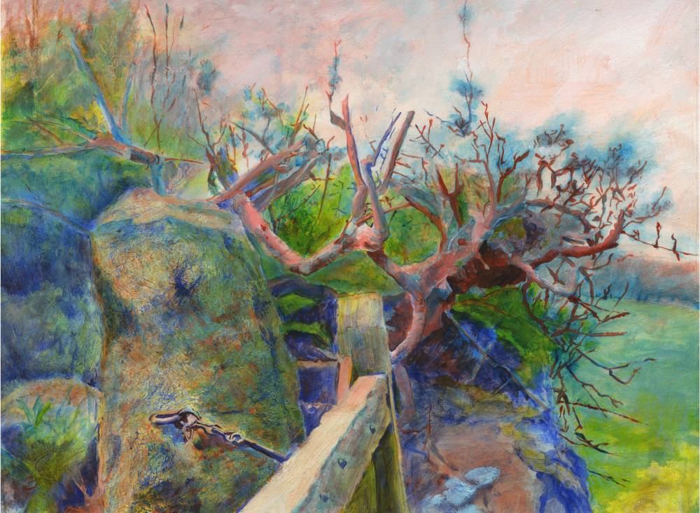 A big old stone post embedded with a metal ring holds the gate at the end of a hedge cut back for winter. Patches of bright green show that Spring is around the corner, The hedge marks the boundary between a field and the woods.