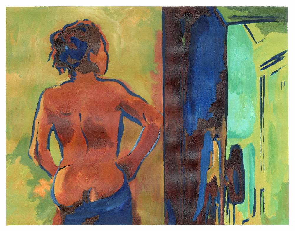 Life painting in acrylic. A woman pauses and listens at an open doorway as she dresses. She is nude from head to hips and has her back to the viewer.