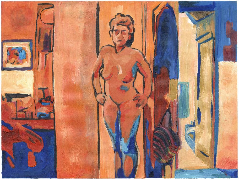 A naked woman stands facing the viewer, hands on hips. She is in the room near an open door, a brightly lit room beyond.